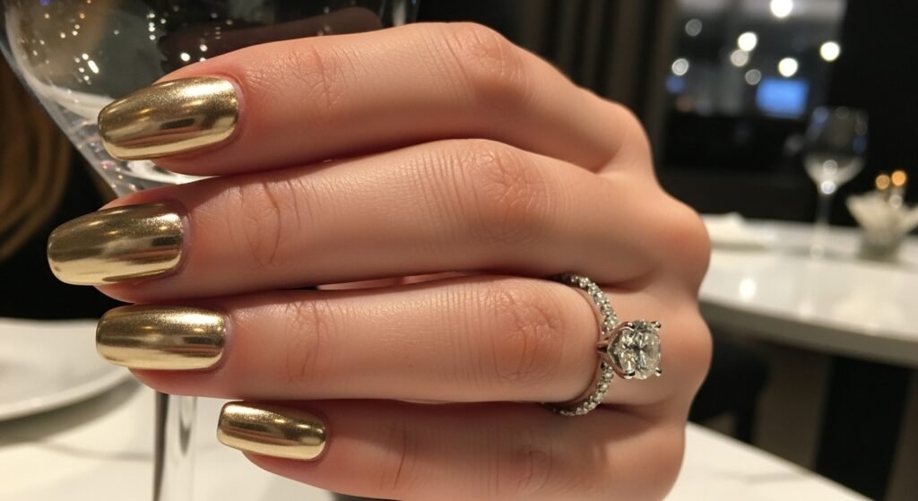 Opt for soft metallics like champagne or blush chrome for a more delicate glow.