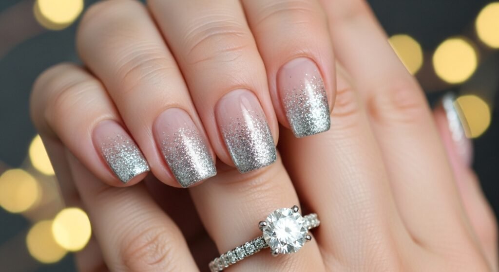 The smooth gradient from a nude base to sparkling tips reflects light beautifully without overpowering your ring.